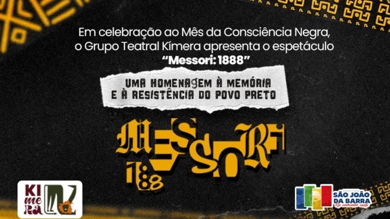 Em comemoração ao Mês da Consciência Negra, o Grupo Teatral Kimera com apoio da Prefeitura de São João da Barra, por meio da Secretaria de Cultura, realizará o espetáculo gratuito “Messori: 1888”, na sexta-feira, 21, às 16h, na Praça São João Batista, na sede do município. A peça é inspirada no poema “O Navio Negreiro”, de Castro Alves, e resgata feridas que atravessam séculos e revelam uma realidade que, embora transformada, ainda ecoa nas margens da sociedade.