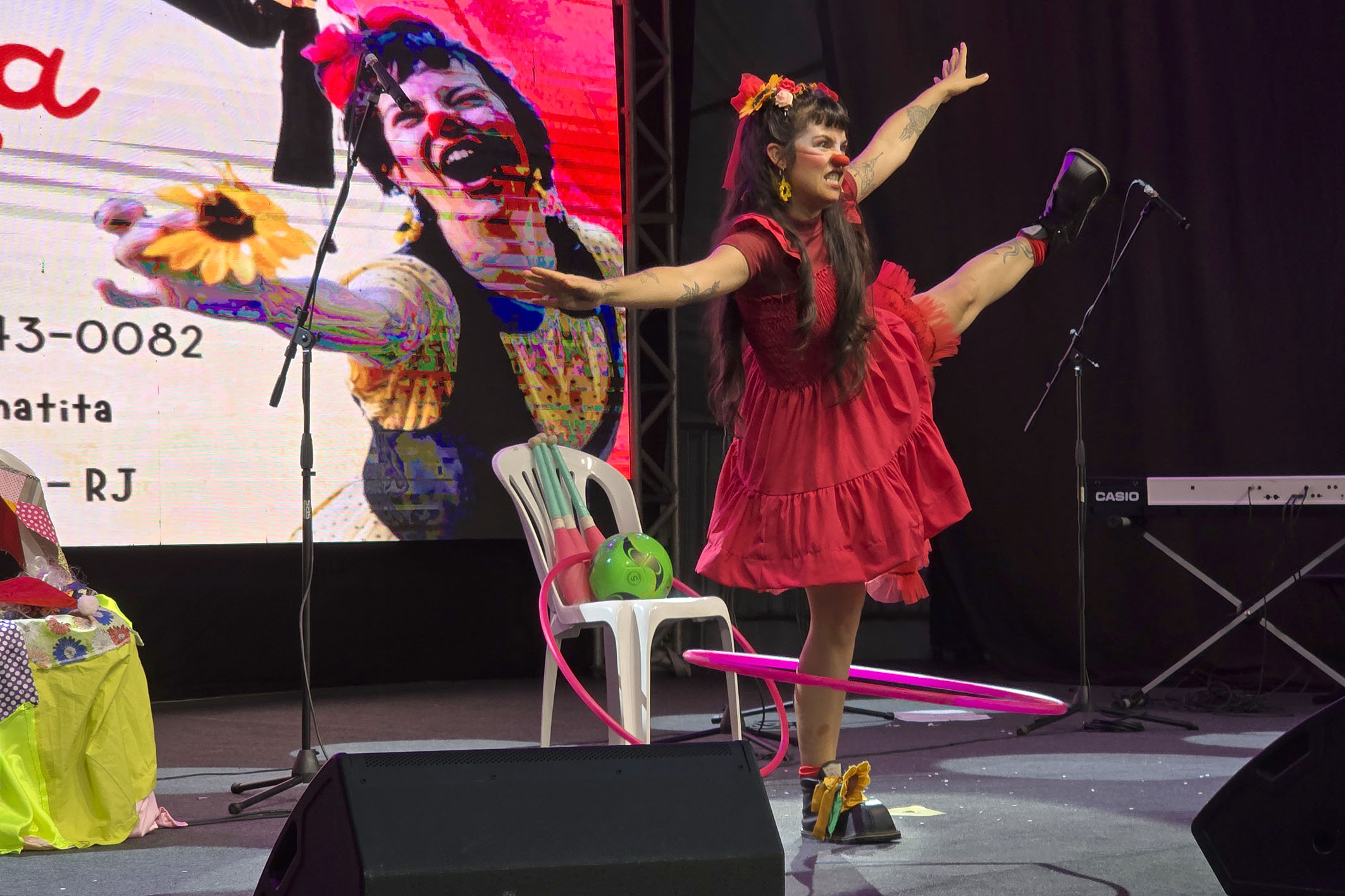 Circo da Matita abriu a noite com poesia, humor e magia. O espetáculo é uma apresentação de palhaçaria feminina voltada para crianças “de 0 a 100 anos”. A artista Matita da Mata encantou o público com cenas que misturaram humor, malabarismo e magia, apresentando brinquedos e objetos que se transformam em personagens e aliados do riso.